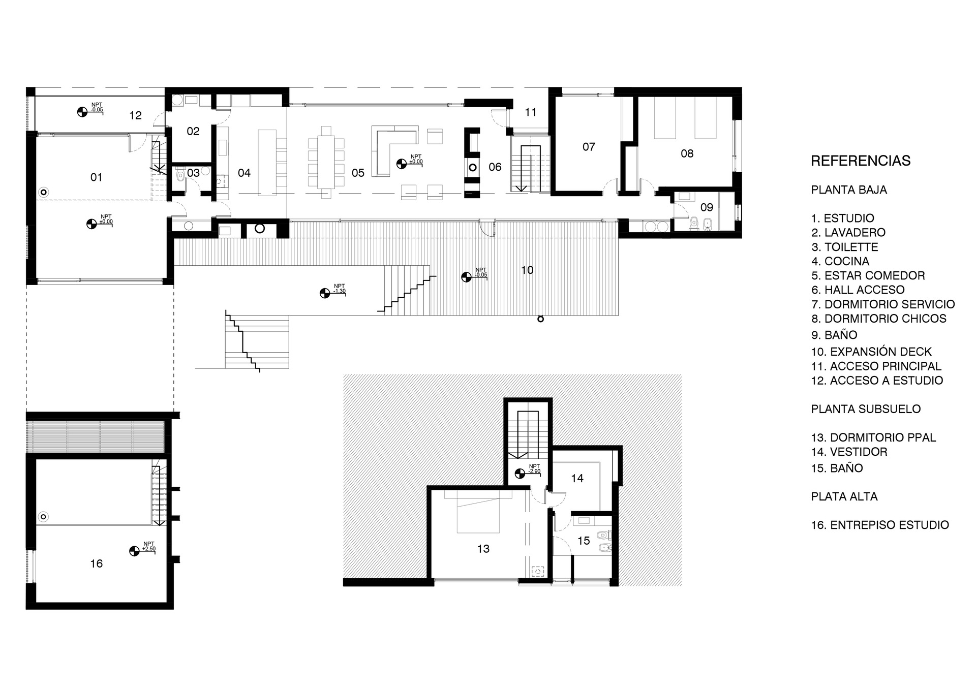 Hacia un sector se volcó el estudio, la parte de servicio sirvió como fuelle, el sector público en el centro generando una transición hacia el área para dormir y descansar que se ubica del lado opuesto, la suite principal en el nivel inferior.