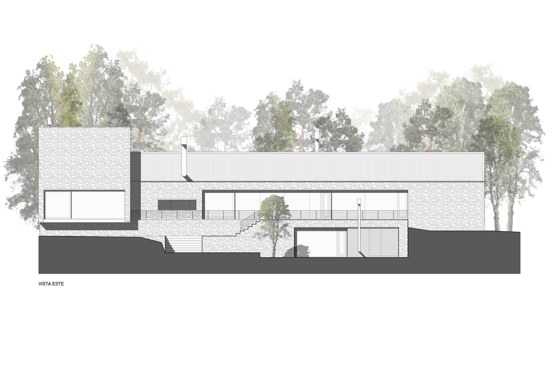 El terreno posee una pendiente moderada pero marcada y constante, descendiendo de oeste a este, que permite abarcar las mejores vistas. La casa se dispuso en forma longitudinal de norte a sur. De manera paralela a las cotas. El dormitorio principal en el nivel inferior actúa como un apoyo contundente con el terreno, de esta manera la casa logra relacionarse con todos los niveles del terreno. Las terrazas de verde fueron transformando y creando distintas situaciones de usos para el parque.