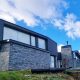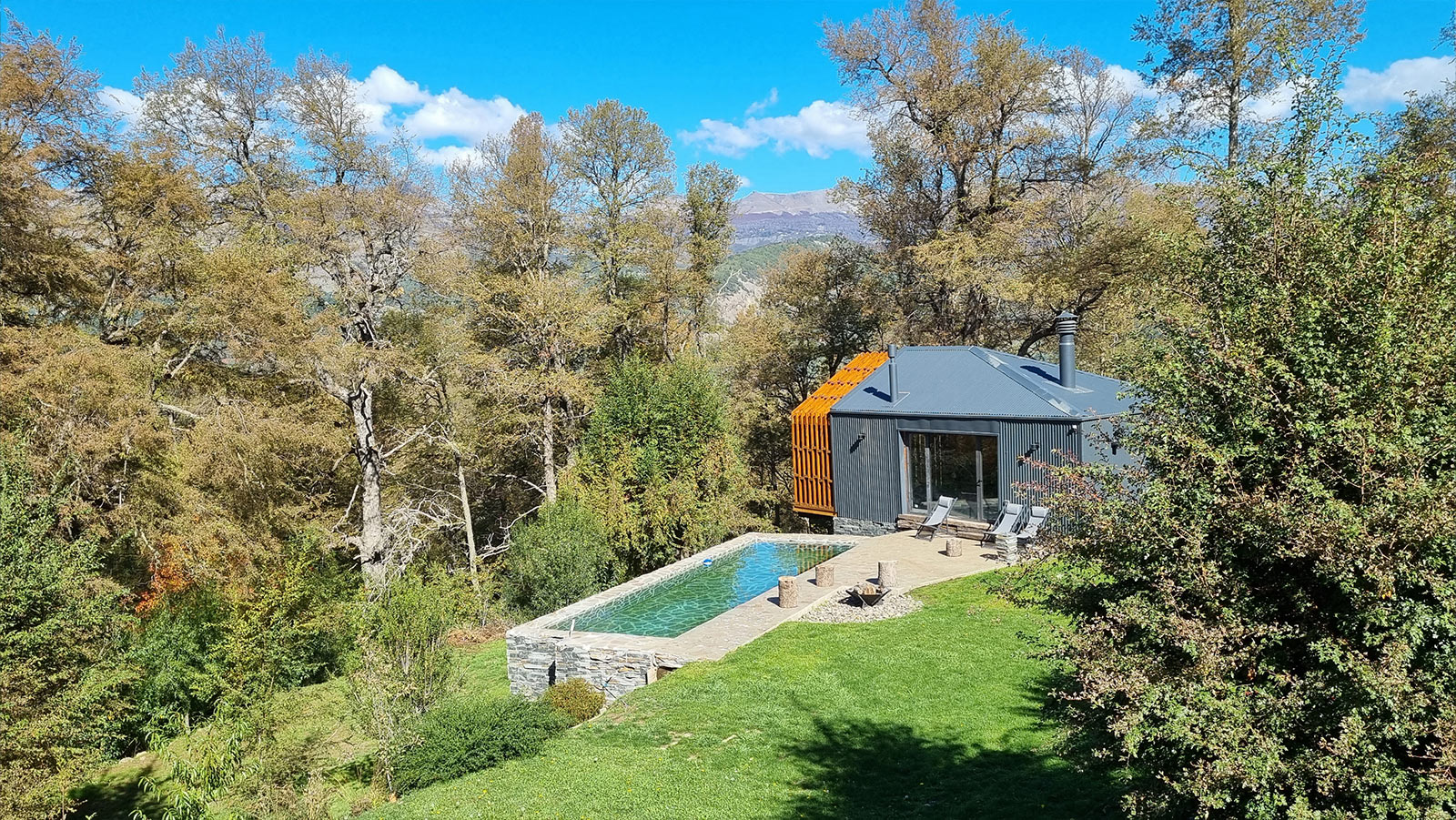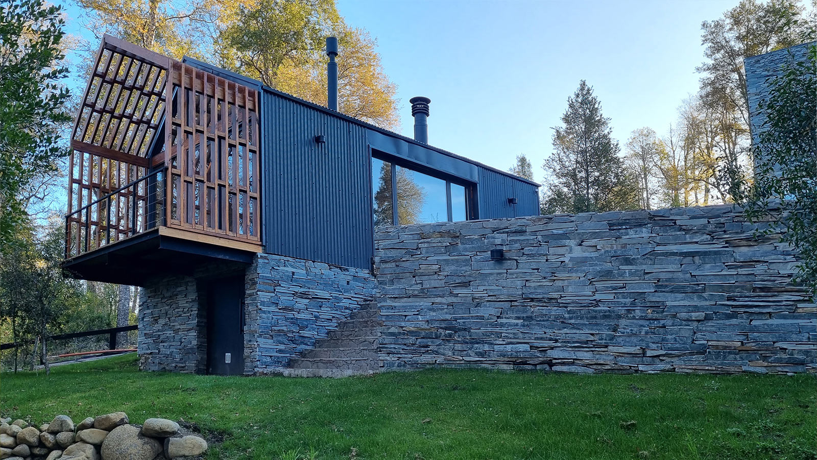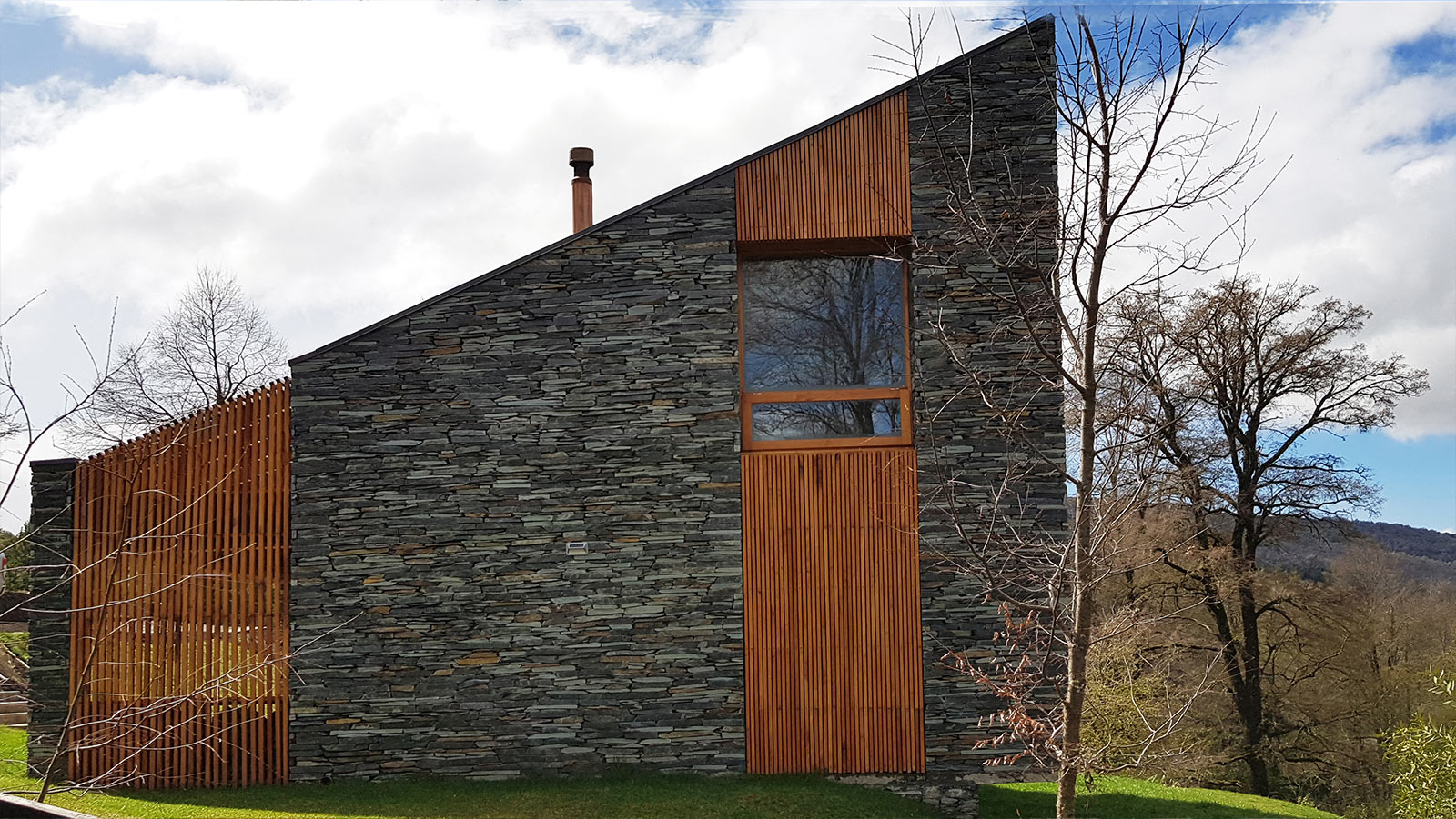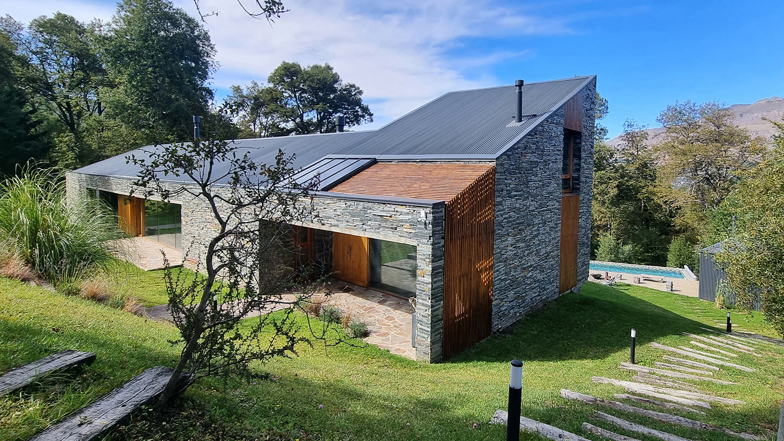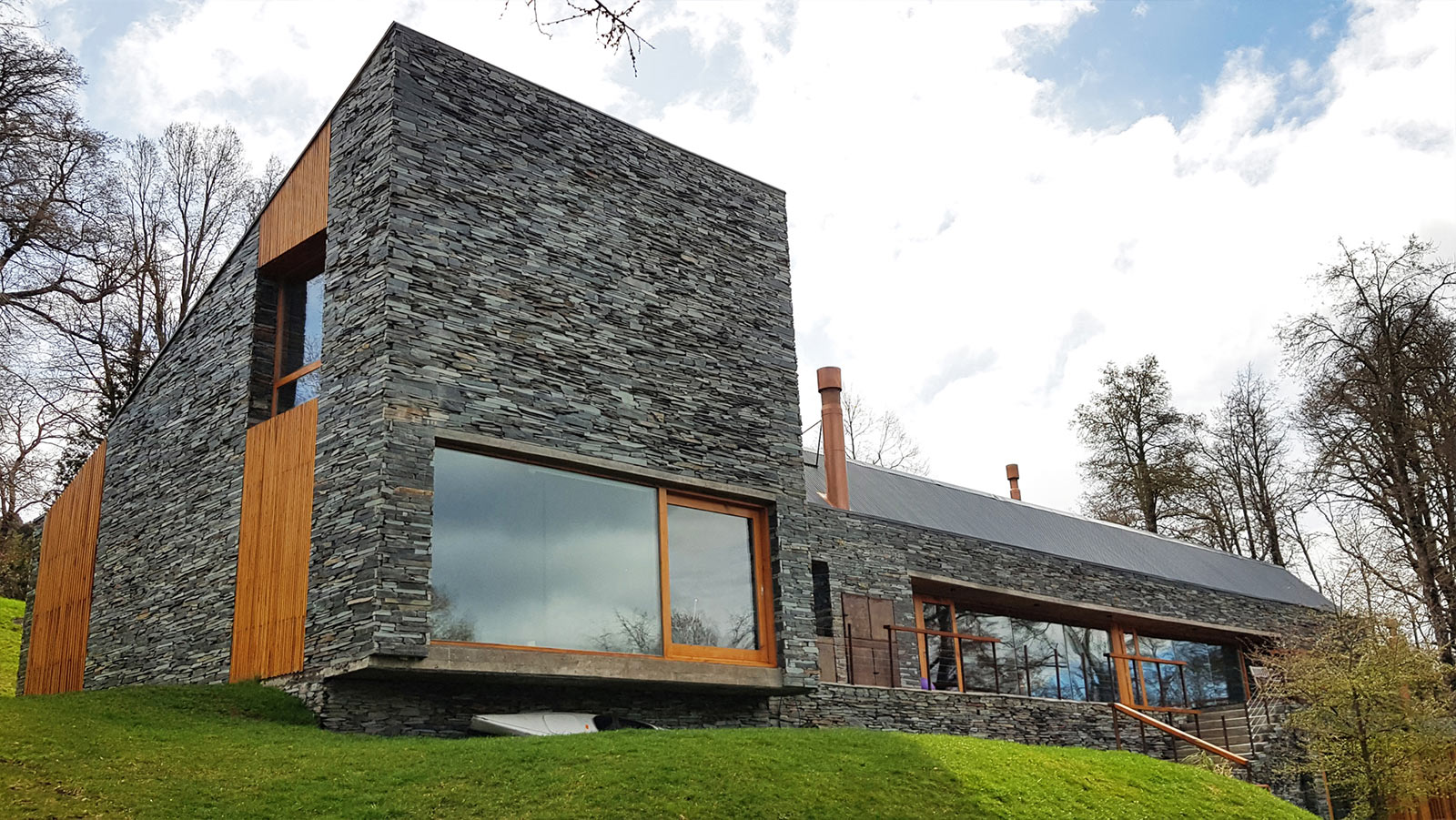 La construcción se realizó con materiales tradicionales aprovechando la mano de obra local. Estructura de hormigón, mampostería y revestimiento de piedra tipo pirca gris en el exterior. Techo de estructura de madera, chapa acanalada gris que genera una continuidad de tonos y volumétrica con la envolvente de piedra. Interiormente las paredes fueron terminadas con yeso aplicado y se destaca como material visual la madera de Rauli en cielorrasos inclinados y en algunas paredes. Las aberturas se encargaron en madera aprovechando la posibilidad de colocar triple vidriado hermético asegurando una excelente aislación térmica en todos los ambientes con grandes paños vidriados.