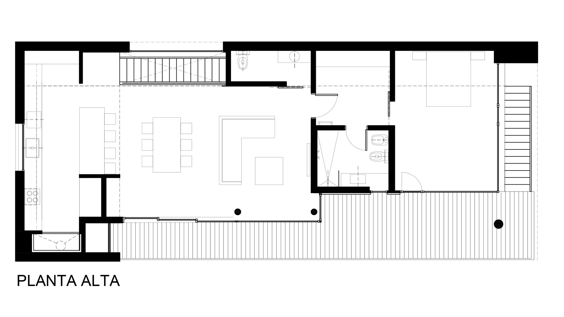En planta alta el dormitorio principal y el área de estar y comedor se destacan espacialmente con sus techos inclinados y cielorrasos de madera de cohiue patagónico. Los ventanales horizontales y continuos crean un interior que se extiende visualmente hacia el paisaje lejano y da amplitud a cada ambiente.