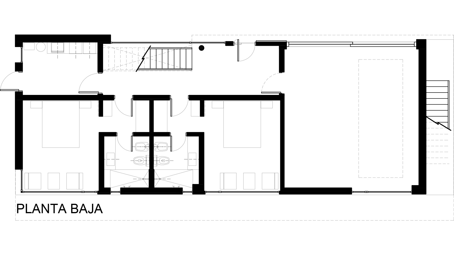 El nivel inferior contiene el hall de acceso y la cochera cubierta, y da paso a dos dormitorios que eventualmente podrán ser tanto para los hijos que vendrán de visita como alquilados temporalmente para turismo.
