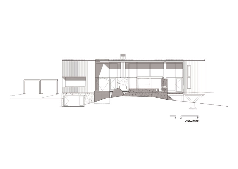 El terreno posee una leve pendiente y poca arboleda, y se encuentra rodeado de impactantes visuales. Buscando generar un mínimo impacto en el terreno la casa se construyó elevada sobre bases de hormigón armado que se van adaptando a los desniveles de la topografía, sobre los que se apoya la platea de madera que sostiene el nivel principal de la vivienda.