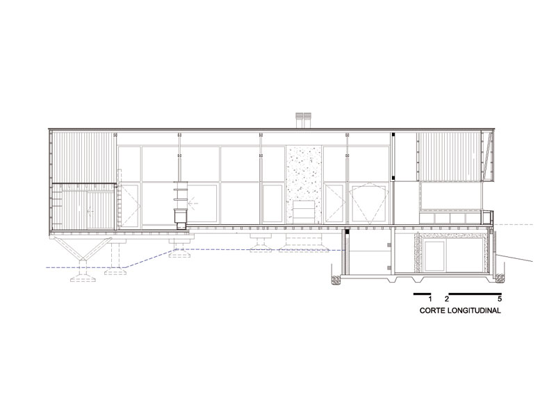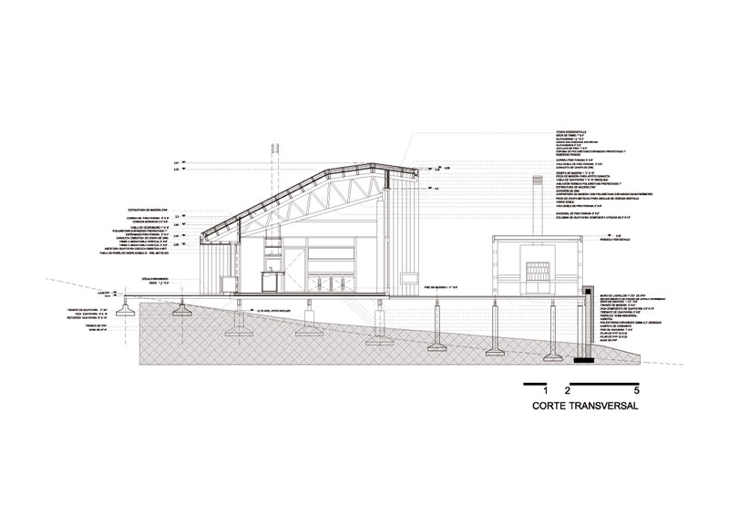 No hay muros que se interpongan, las cerchas que sostienen la cubierta apoyan sobre columnas exentas de madera ensambladas, permitiendo la fluidez espacial. Acompañamos y pusimos en evidencia esta continuidad espacial también hacia el exterior, los ventanales enfrentados permiten que el paisaje atraviese y diluya el espacio interior, que se expande hacia los decks exteriores de madera.