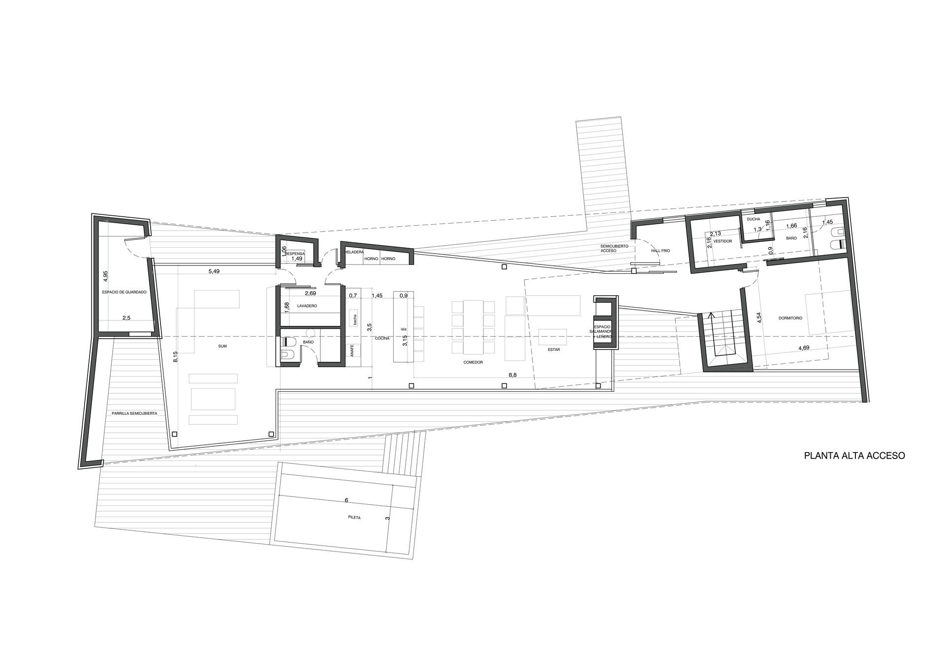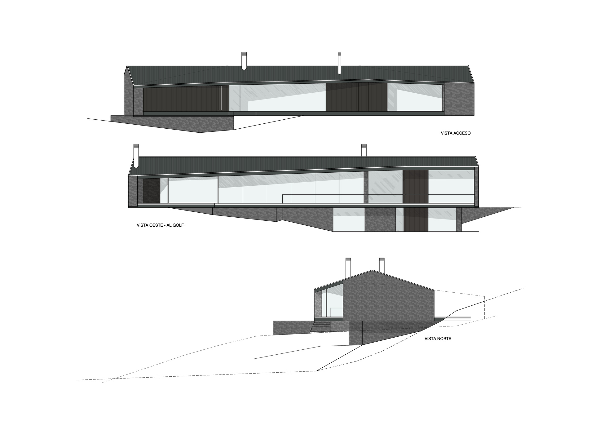 Ubicado en lote con una pendiente intensa, desde donde se aprecian las vistas hacia el lago Lacar, ubicado a la distancia, el proyecto busca crear una vivienda destinada al uso de vacaciones, donde los ambientes puedan disfrutarse en familia y compartirse. La planta alta se convierte en un gran mirador que es traspasado por el paisaje. Las sutiles diagonales crean un juego visual con el entorno de montañas y vegetación, dispuestas bajo un gran techo que cubre y protege del clima y del sol del oeste.